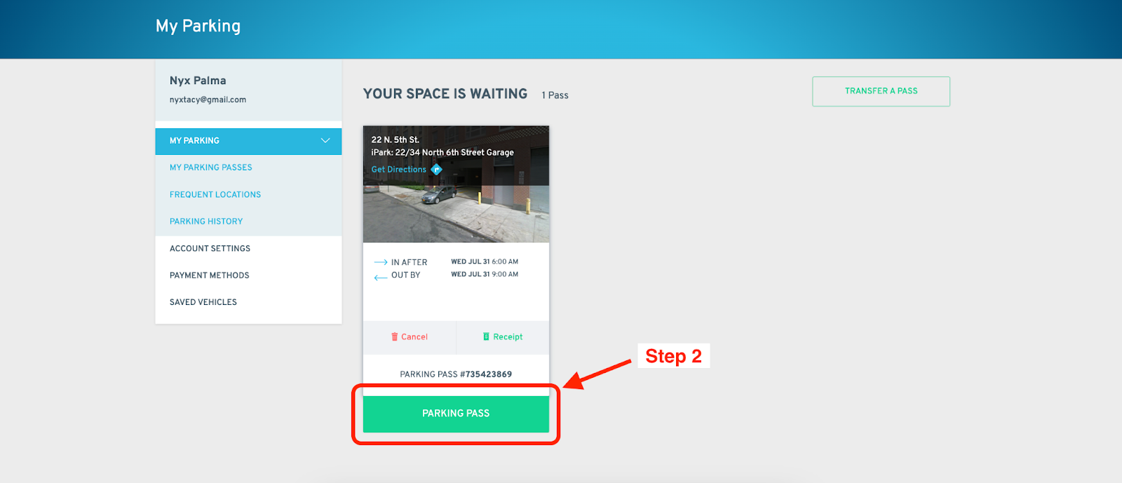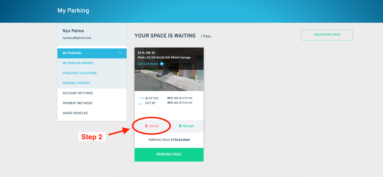 Option 1: Log in, tap MY PARKING on the bar at the bottom of your screen, then tap the CANCEL button on the pass under the “Upcoming Bookings” section.