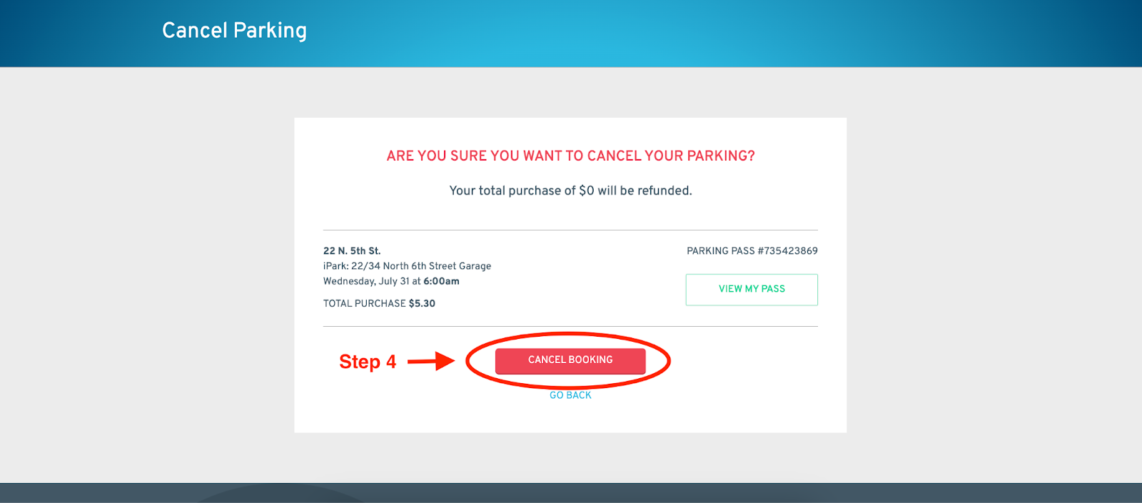 Option 2: Log in, tap MY PARKING on the bar at the bottom of your screen, tap VIEW PASS, scroll to the bottom of your pass, then tap “Cancel this booking” under the “More” section.