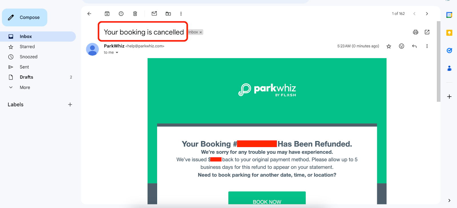 Once your cancellation is complete you will receive an email confirmation titled "Your booking is cancelled" alerting you to your cancellation completion and refund.